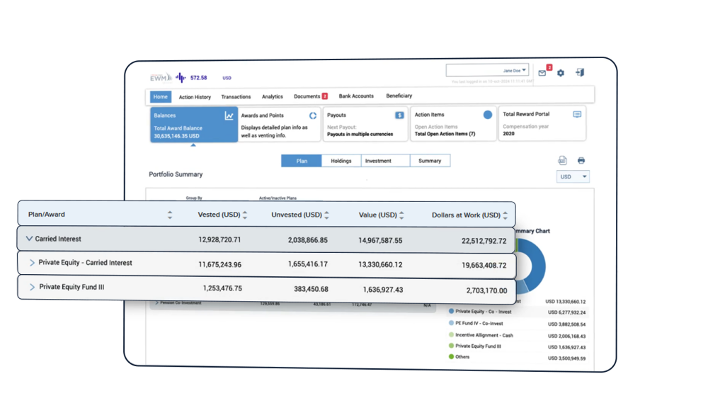 Employees gain a single view of total compensation — including salary, bonuses, carry, and co-investment balances. Customisable, always up-to-date reward statements help participants understand and value their incentives. Plan sponsors can control release timing, display options, and reporting, ensuring transparency and engagement across the firm.